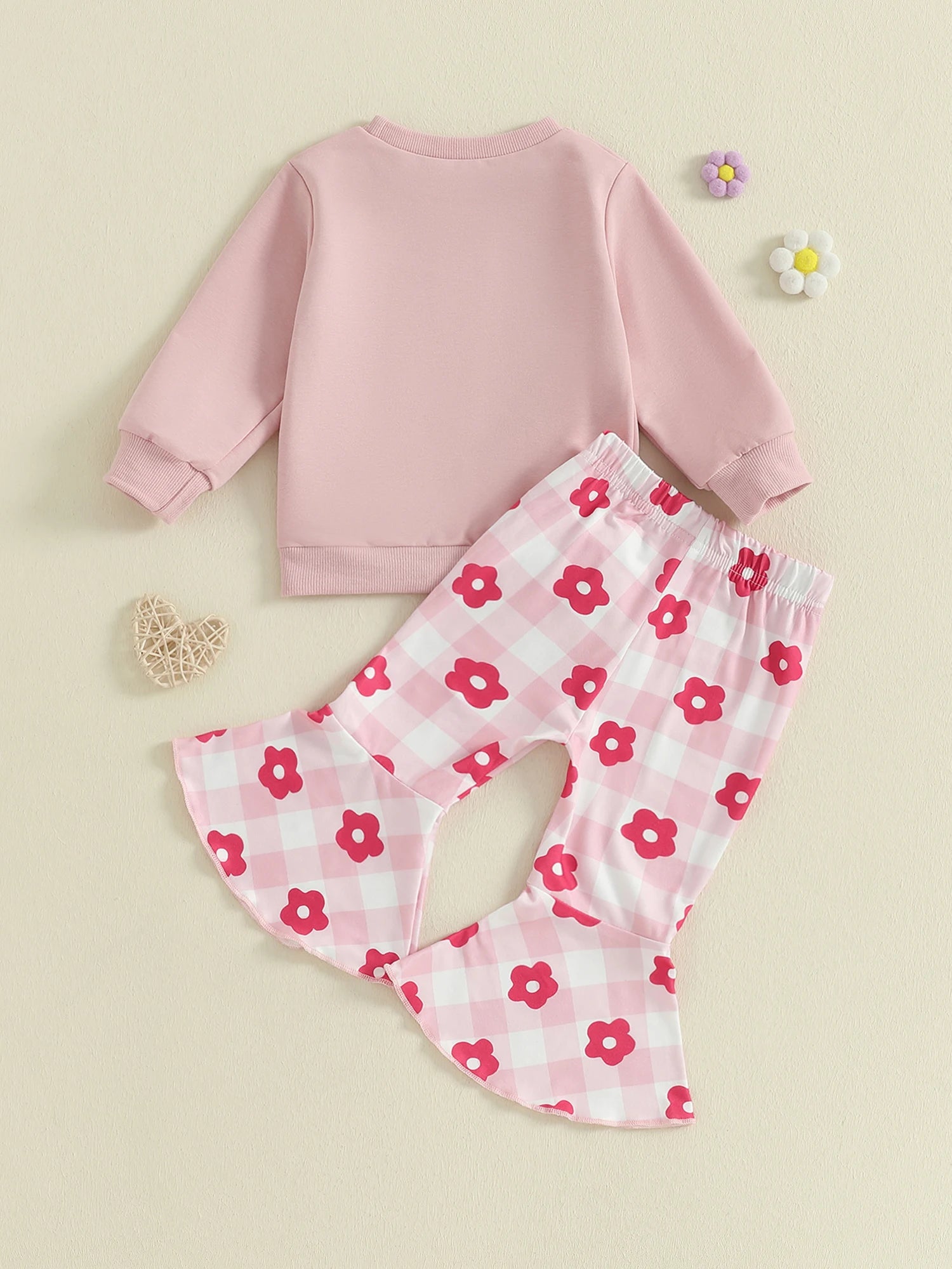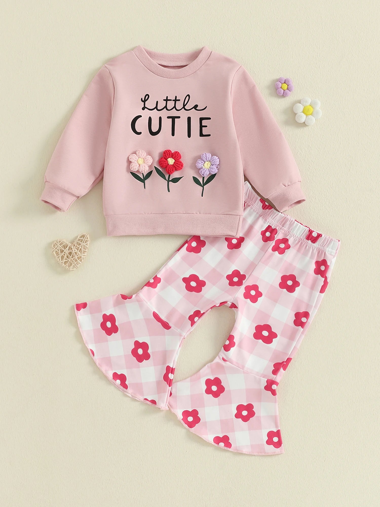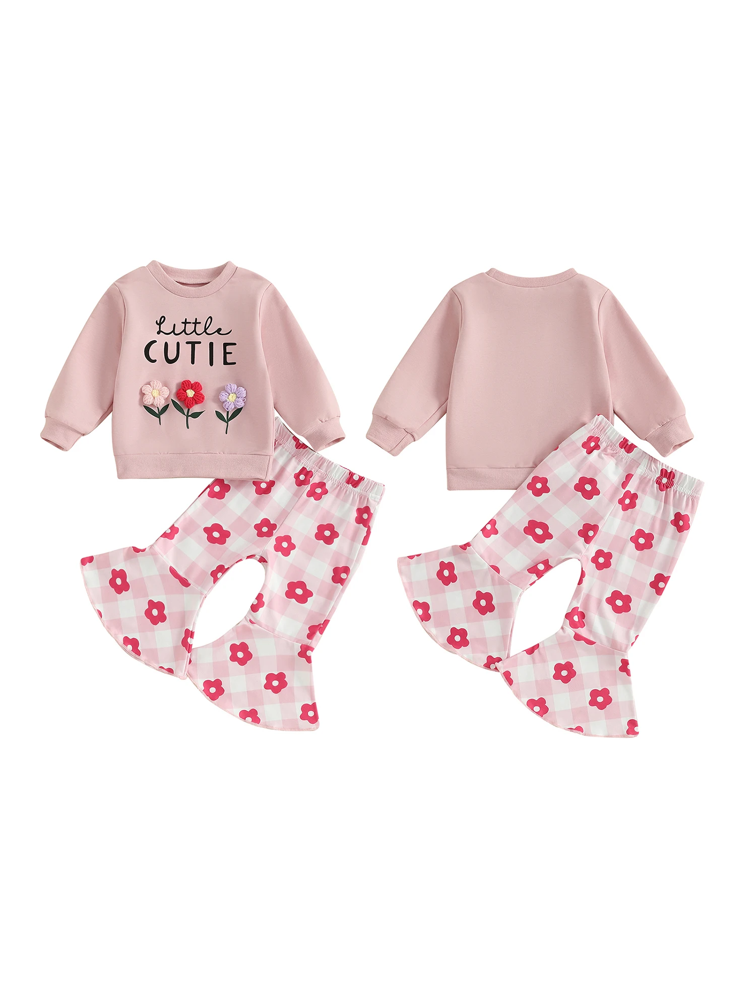 Toddler Girl Fall Outfits 3D Flower Long Sleeve Round Neck Pullover + Elastic Waist Plaid Flare Pants 2 Pcs SetSize(cm)