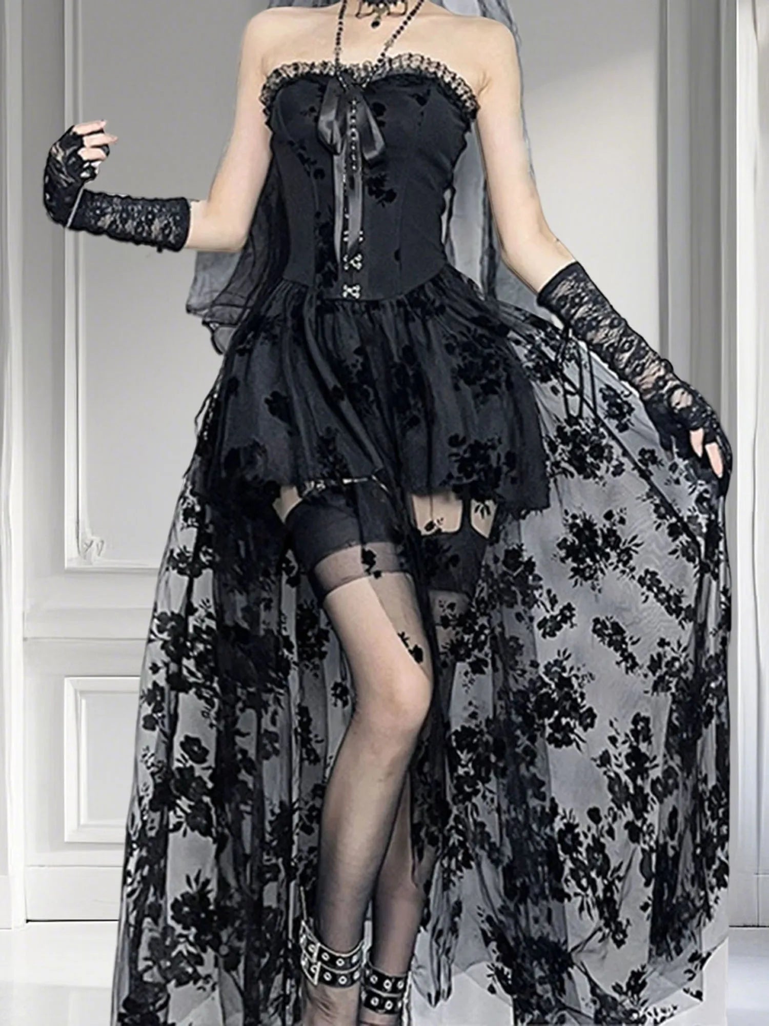 Black Lace Off Shoulder Maxi Dress for Women Vintage Victorian Gothic Embroidered Sleeveless A-Line Gown with Mesh Insets