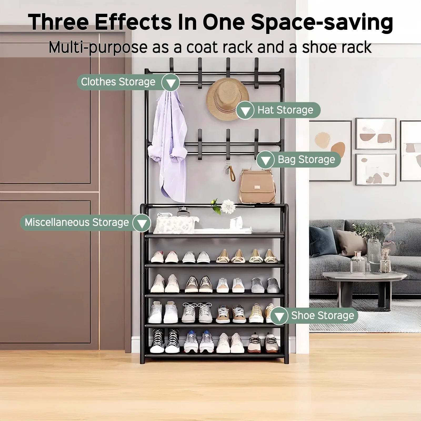 Coat Rack with Shoe Rack Organizer, 3-in-1 Metal Hall Tree with 5-Tier Shelf and 8 Removable Hooks, Freestanding Coat Shoe Rack