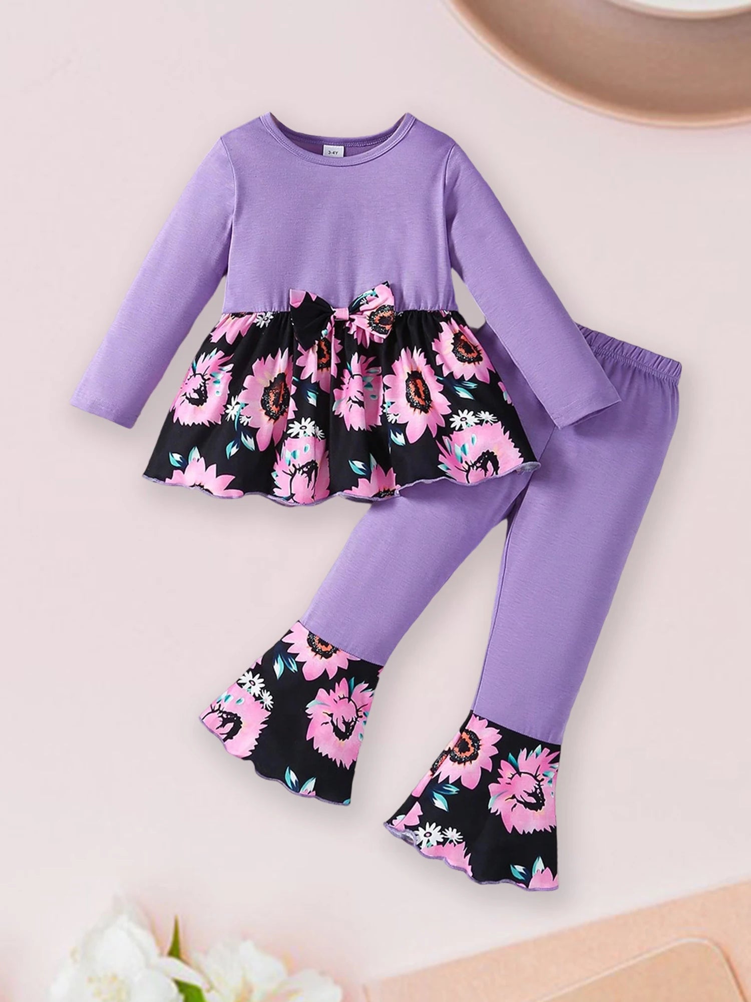 Girls Autumn Fashion Floral Print Round Neck Long Sleeve Top and Flared Pants 2-Piece Outfit Set for Kids