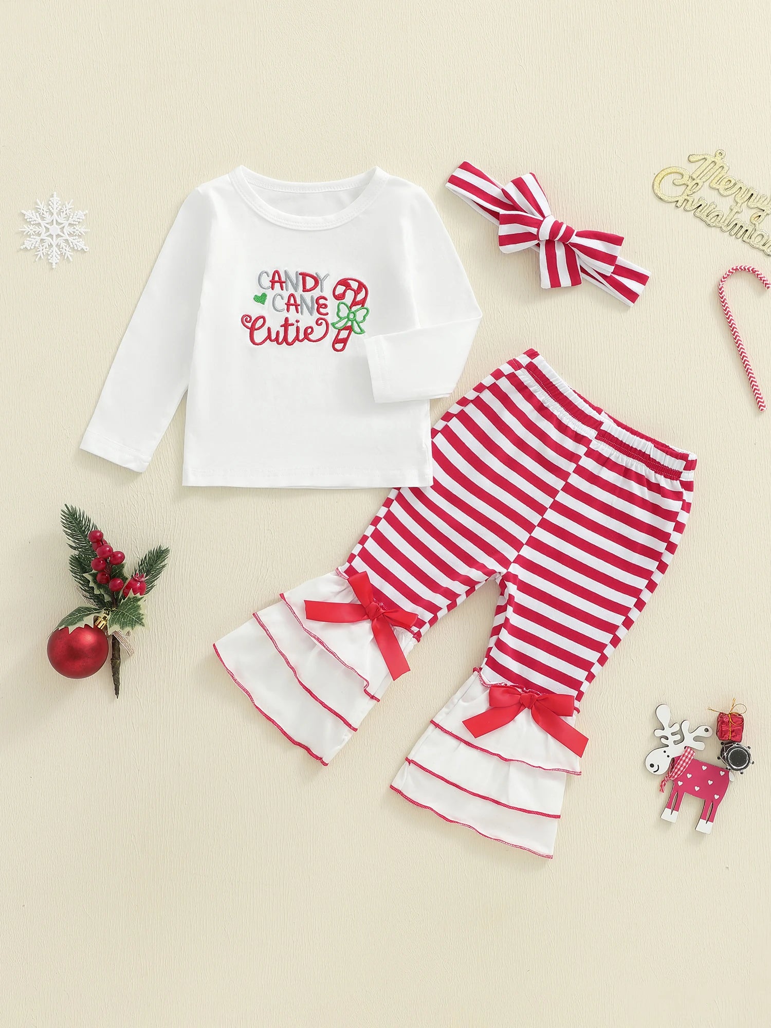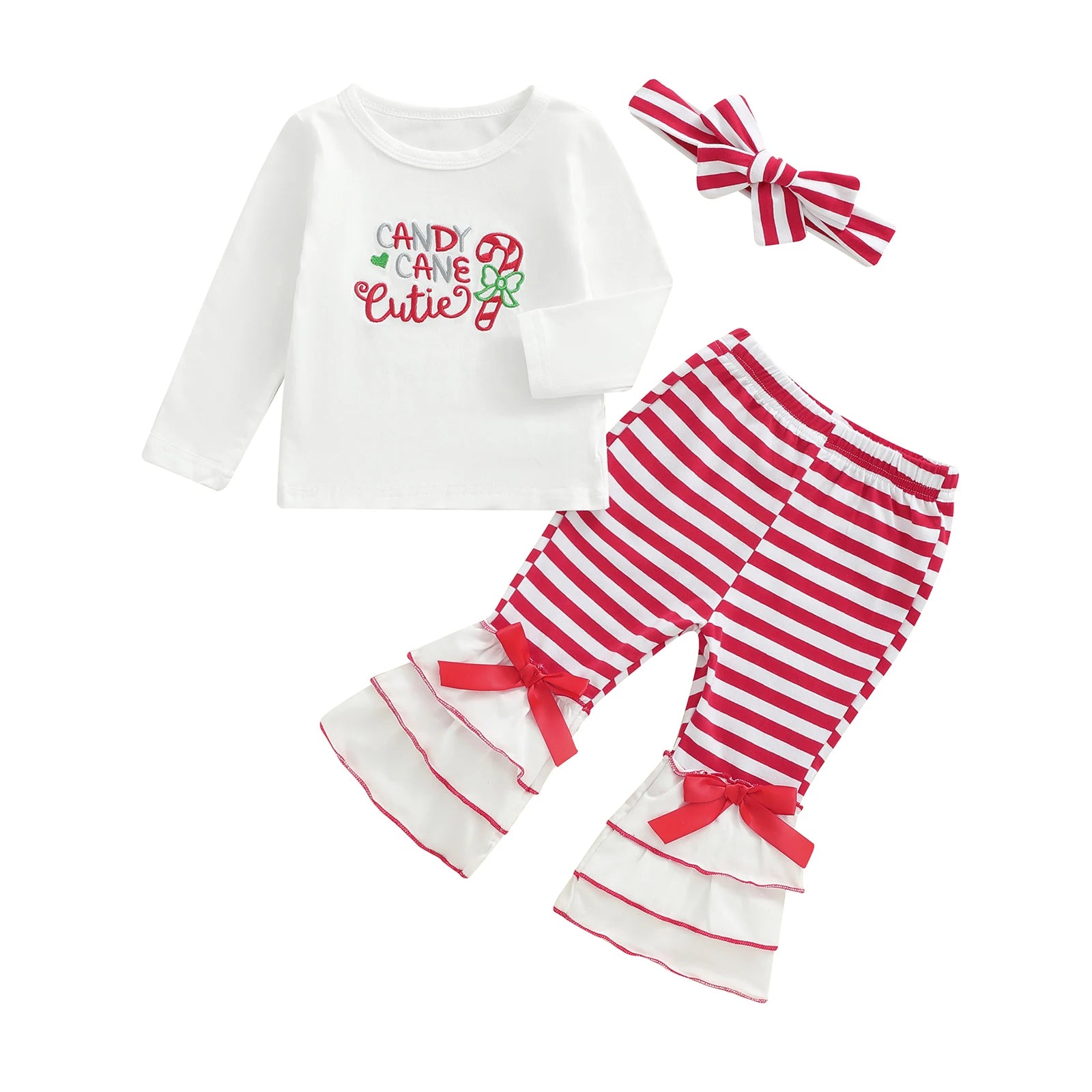 Toddler Girls Christmas Pants Sets Candy Cane Letter Embroidery Long Sleeve Tops Flared Pants Headband SetSize (cm)