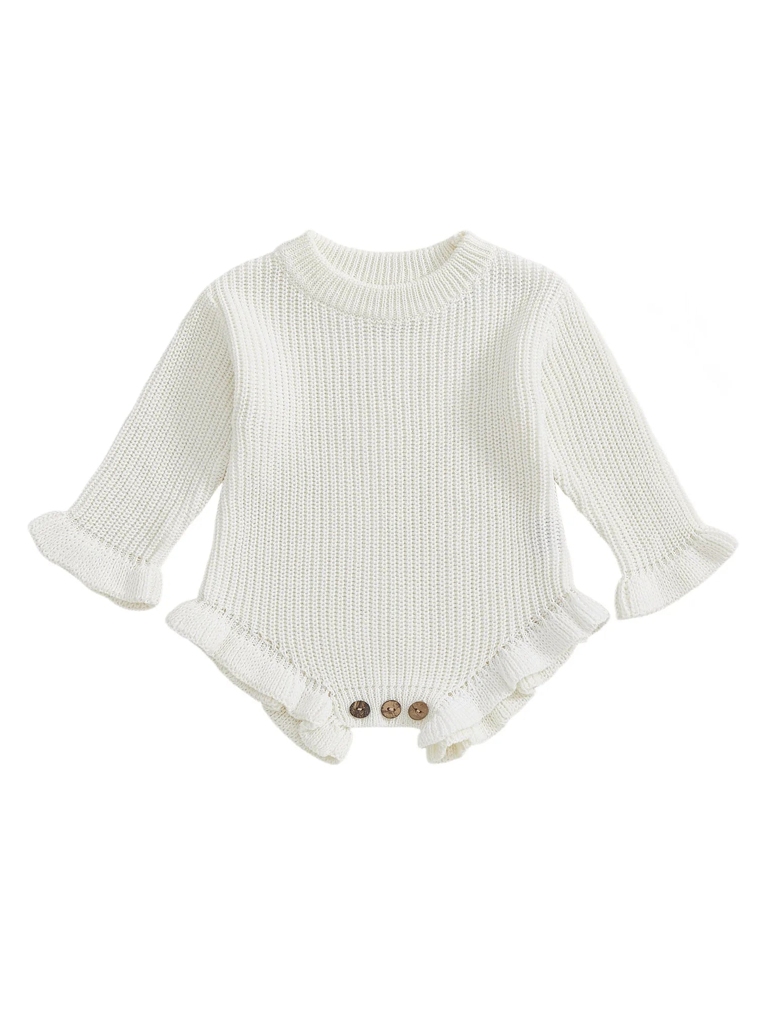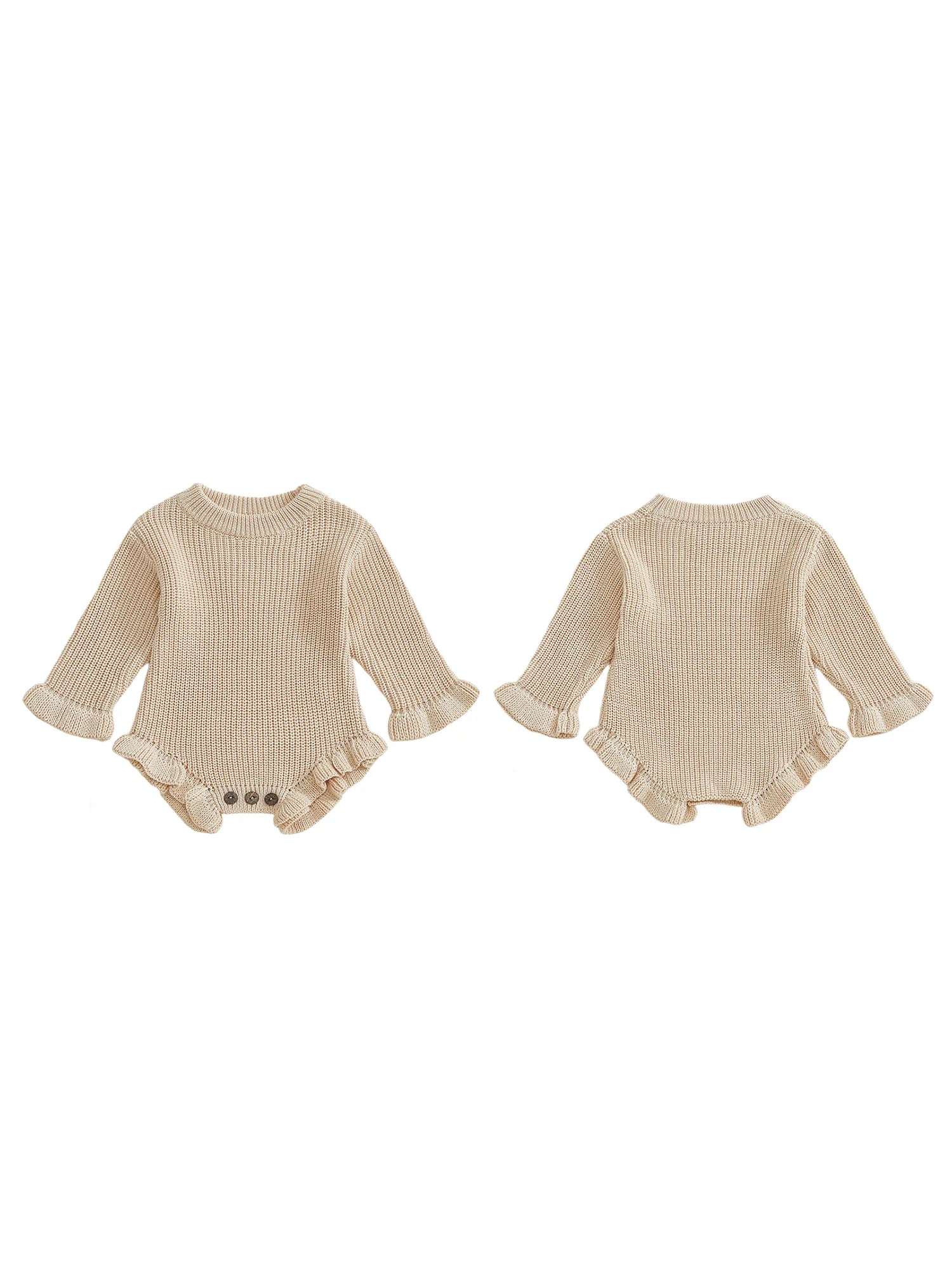 Infant Autumn Knitted Bodysuit with Ruffled Sleeves and Round Neckline Solid Color Sweater Jumpsuit for Baby Girls
