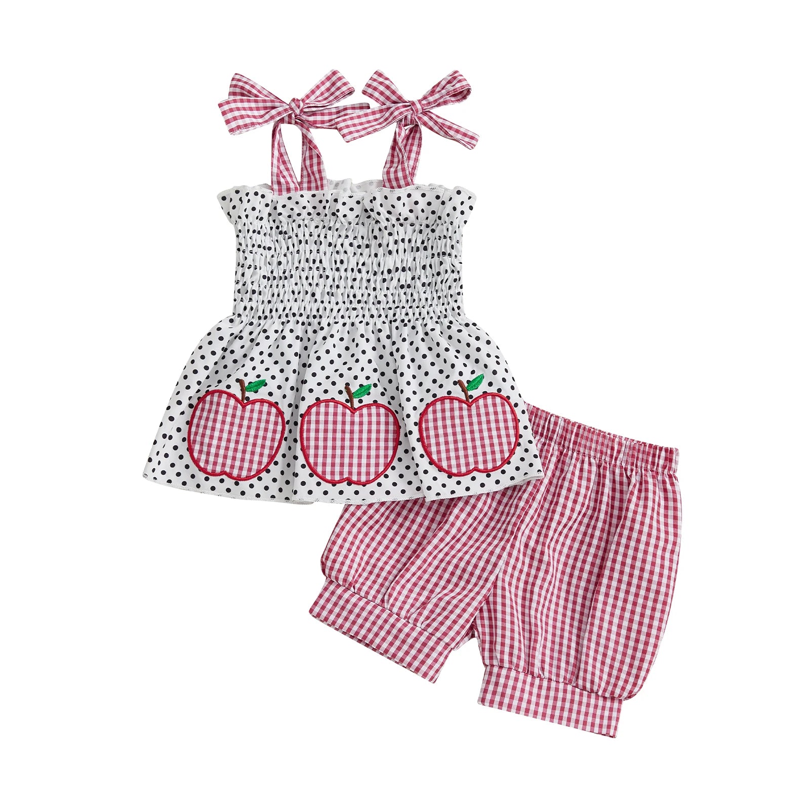 Kid Girl Summer Clothes Dot Print Smocked Tie-up Strap Camisole + Solid Color Shorts 2 Pcs SetSize(cm)